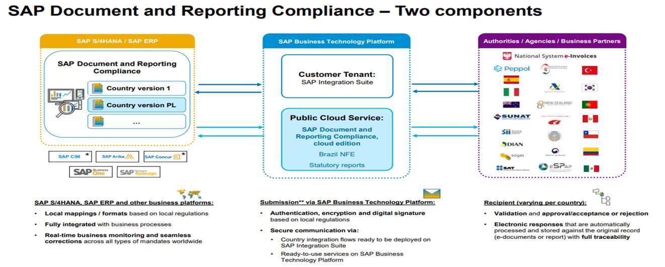 Moduł SAP Document and Reporting Compliance (DRC) wspiera firmy w zarządzaniu e-fakturowaniem oraz obowiązkowym raportowaniem. Integruje się płynnie z systemami SAP (S/4HANA), pozwalając firmom na automatyzację raportowania podatkowego w różnych jurysdykcjach i zapewniając zgodność z lokalnymi przepisami.